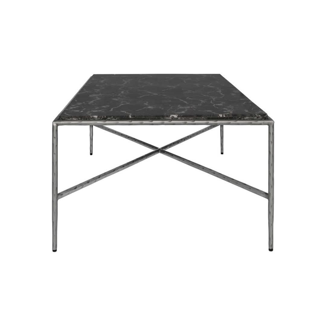 La cubierta de mármol natural aporta elegancia, textura y un acabado atemporal, mientras que la base de acero forjado a mano destaca por su acabado martillado, realizado golpe a golpe con martillo, creando una superficie intencionalmente imperfecta, orgánica y única. Cada marca, cada irregularidad y cada variación forman parte del diseño, evocando el gesto artístico y la fuerza expresiva del trabajo manual.